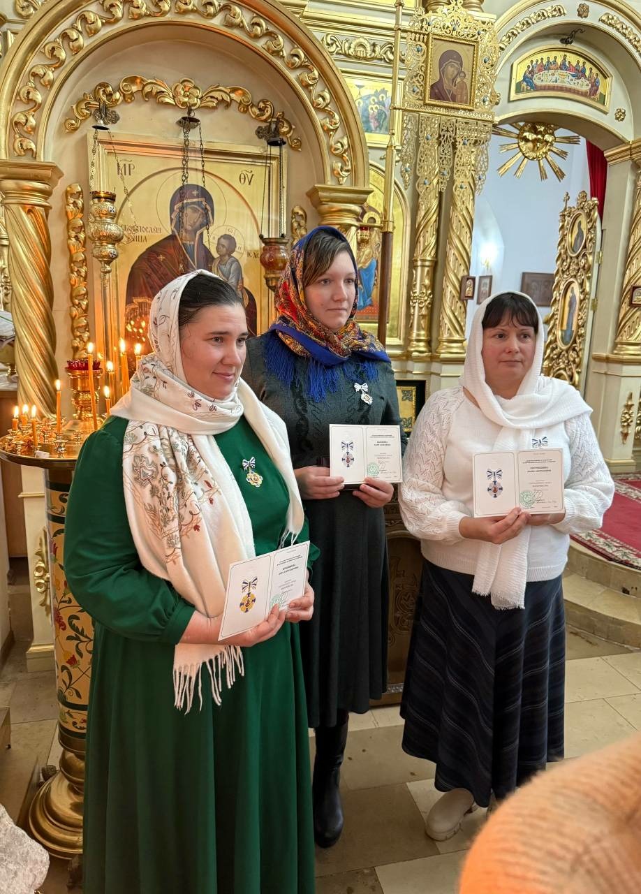 Патриаршие награды в благословение за чадородие и жертвенное материнское служение правящий архиерей вручил Анне Александровне Мушниковой, удостоенной Патриаршего Знака Материнства I степени, Елене Анатольевне Растопшиной и Юлии Алексеевне Пышкиной, удостоенных Патриаршего Знака Материнства II степени.